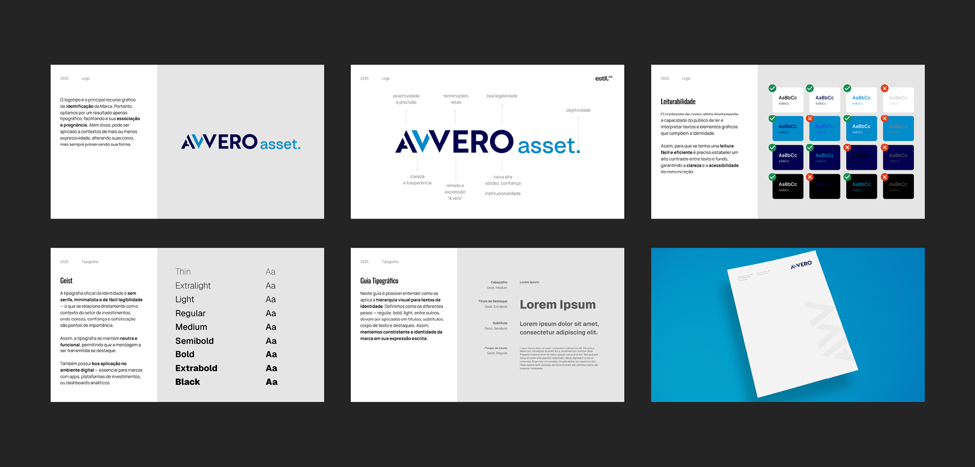 A tipografia reta e bem definida expressa objetividade e institucionalidade, e o conjunto da identidade se adapta com elegância e funcionalidade a diferentes suportes no universo do mercado financeiro.