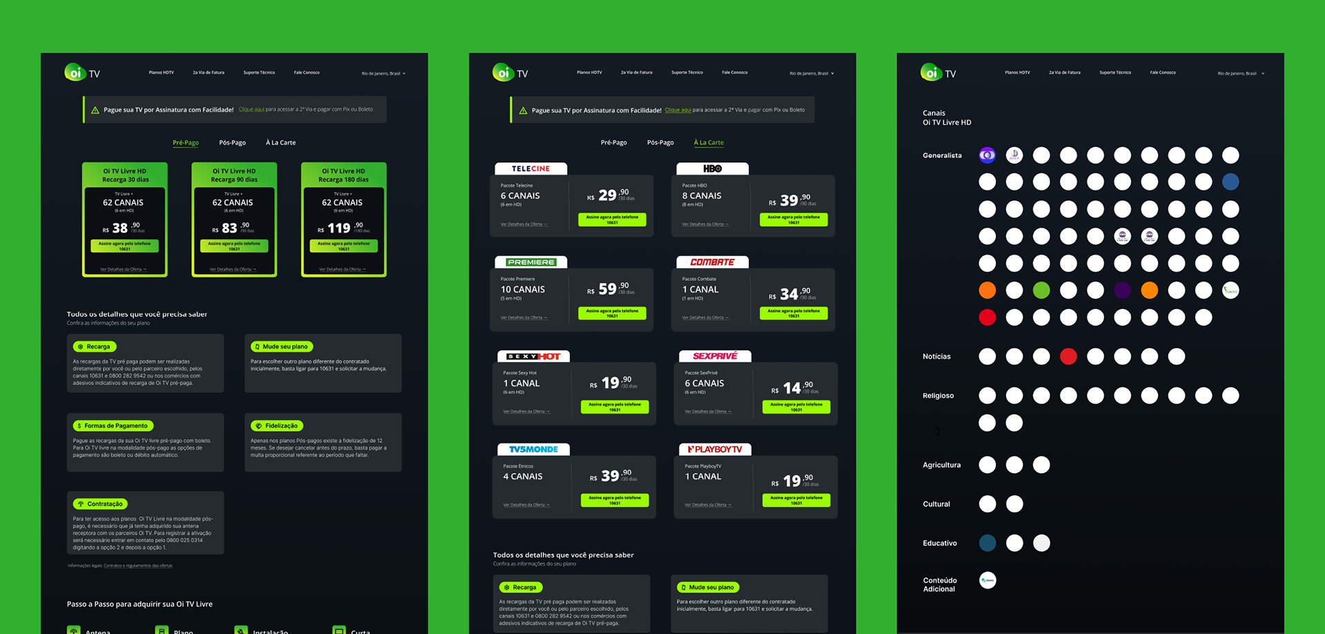 The Oi TV website was developed in desktop and mobile versions with the aim of presenting and promoting the content, channels, and benefits of the brand's pay TV service.